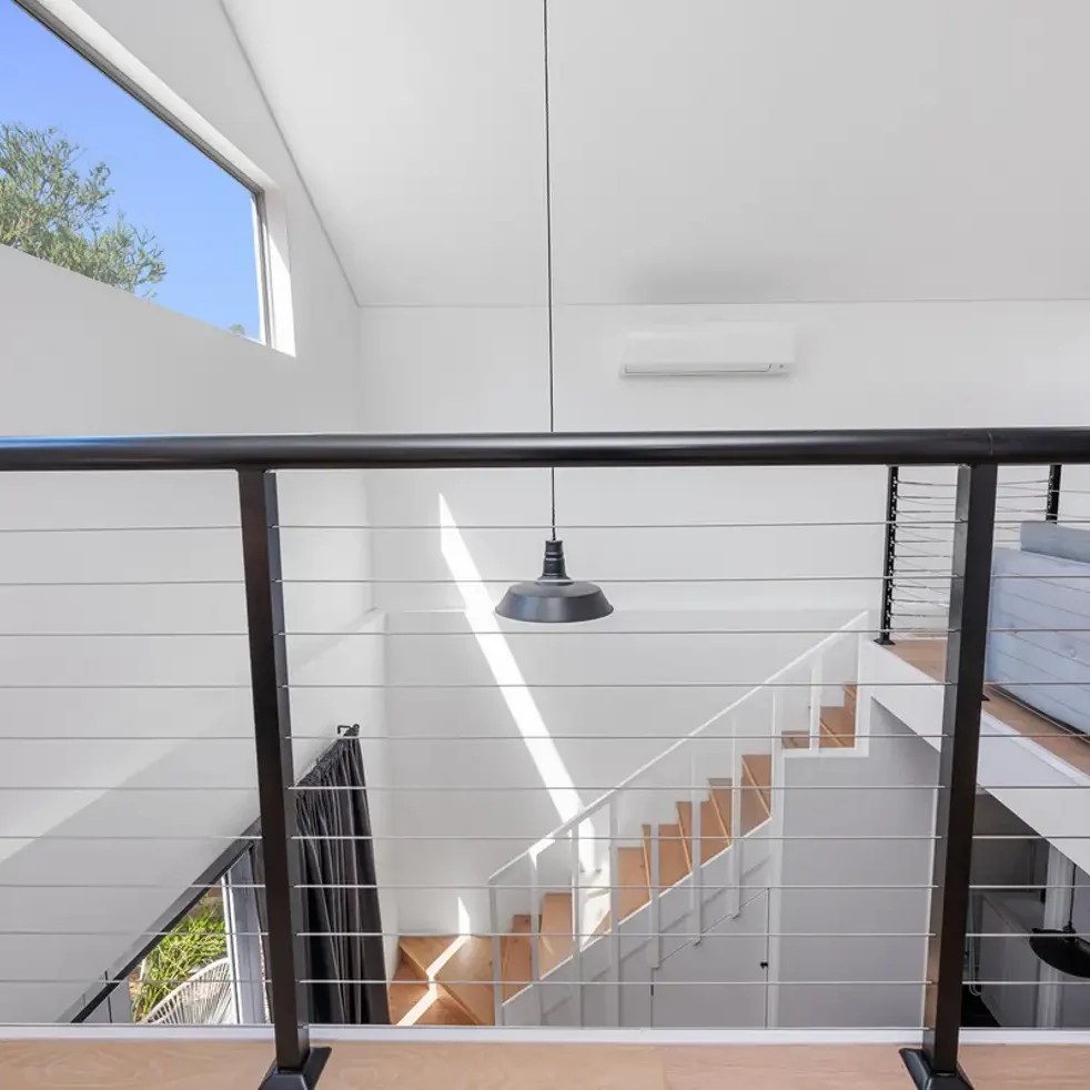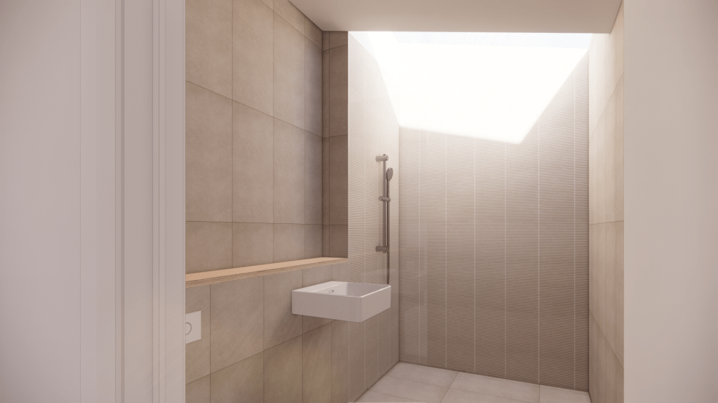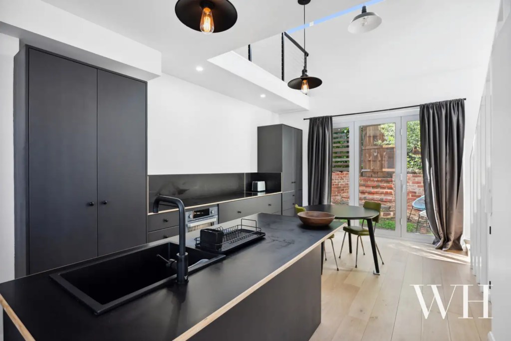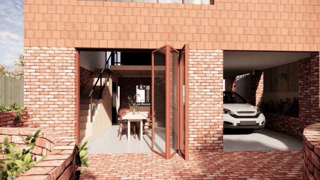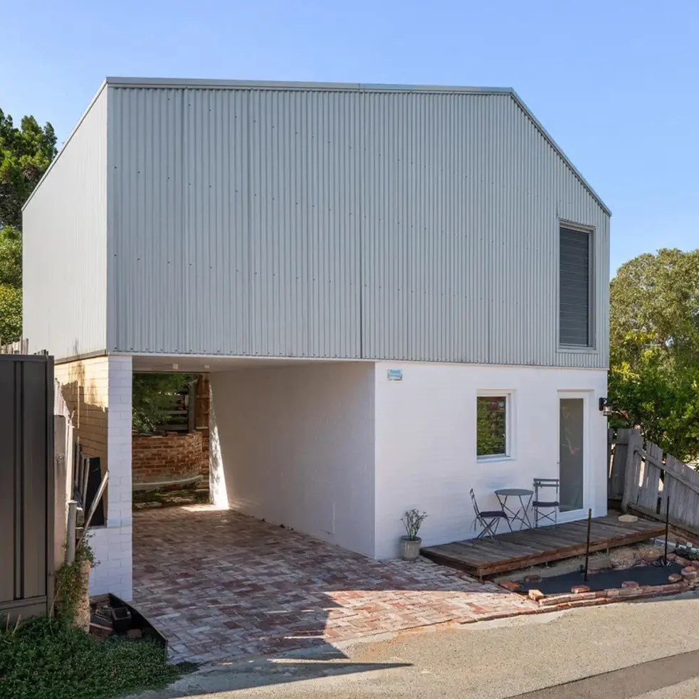 The proposal was for a small dwelling at the back of a long block that served a young couples parents when they visited from overseas. When it was not occupied, it is used as short term accomodation. This small one bed and one bath studio feels larger than what it is primarily through the large open void defining the internal spaces.